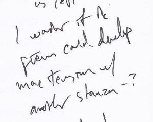 Further, there is a progression in the exploration of the word cadenza even in this short passage that pulls the reader along. Cadenza is a musical term and Estes plays off of it, both denotatively, i.e. as an actual artistic interlude as she plays with the word and its origin as a kind of credenza in poetry, in and of itself, and on a connotative level, as she plays with a progression of the words around cadenza, like a “chord” progression which she references in the third line from the bottom.