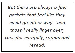 In both of these poems, you can indeed feel a ‘make you or break you stake in the words and content.’ It manifests itself as a kind of intensity. In “Pentecost” the rhythm is as pulsing as, well, a Pentecostal church service. The language is lush and startling (or do we call that, surprising), e.g. wielding the Book’s hot gospel like a blunt instrument. In “Ritual” the language seems to twist and turn from what one might expect, e.g. rather than casting the bread upon the waters (from Ecclesiastics 11:1), Mitchell writes of the casting of the word bread upon the word water. Also, there is no capitalization or sentence punctuation in the poem. As you read, you often feel you are coming to the end of a sentence, but instead, the poem takes you off into another idea that plays off the last idea. It’s an intriguing structure—a long run-on—that supports an overarching sense of the personal questioning and rumination that runs throughout the poem.